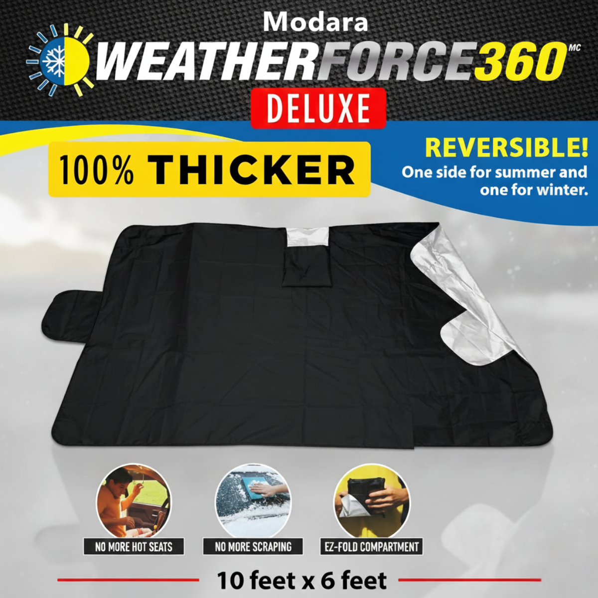 The Modara WeatherForce 360 protects your windshield year-round. Reversible design blocks winter ice and snow, then flips to reflect summer heat and keep interiors 40°F cooler. Theft-proof anchors and gust-resistant magnets stay locked in place. Save 10 minutes every morning