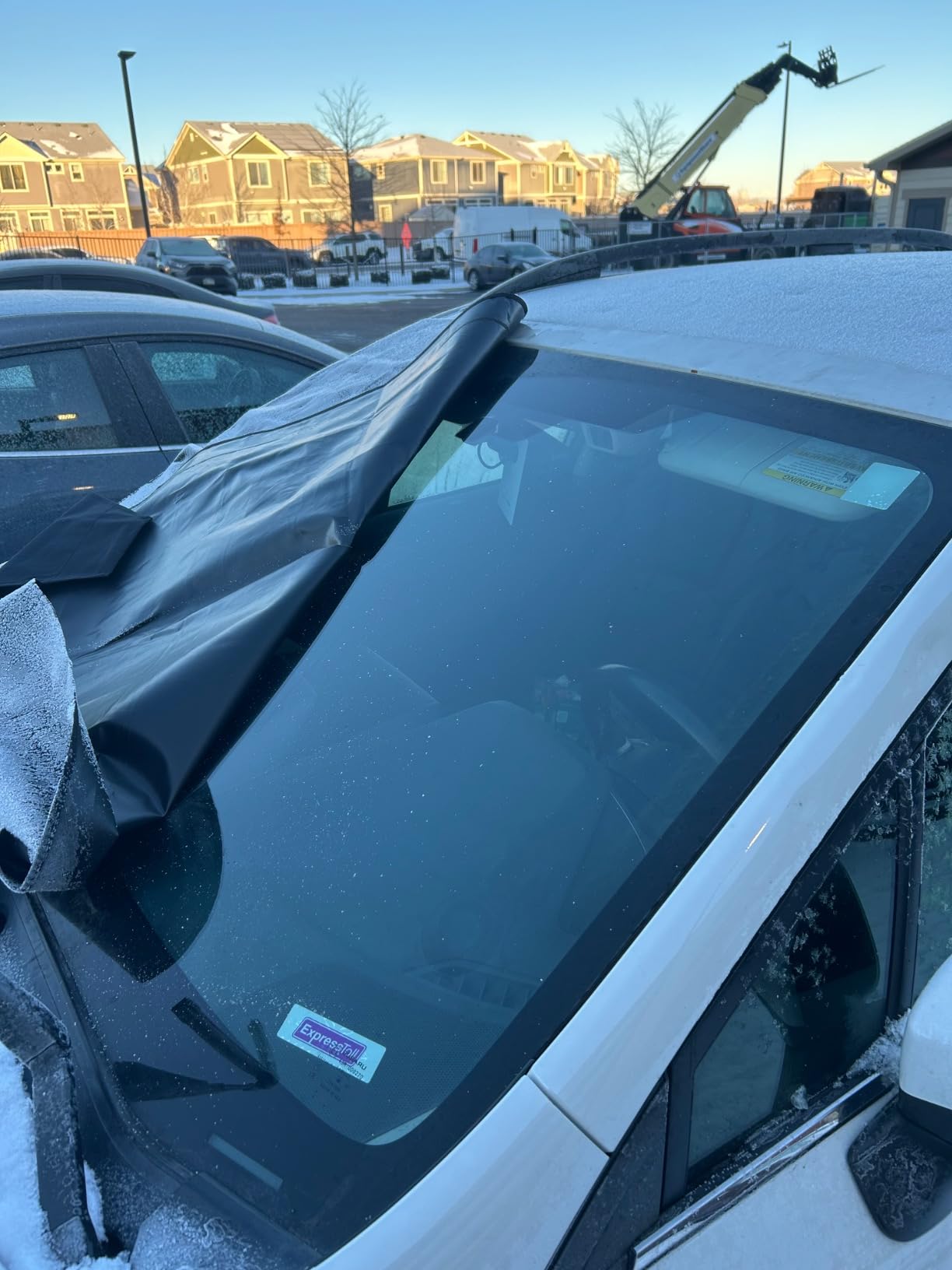 We got slammed with a huge snow storm last weekend, 8-12 inches of snow on top of freezing rain & sleet. Thank goodness I had ordered this windshield cover in time!! And we're due for more snow again tonight. Very pleased! Material: Tough as nails & holds up to the weight of all that snow & ice great!